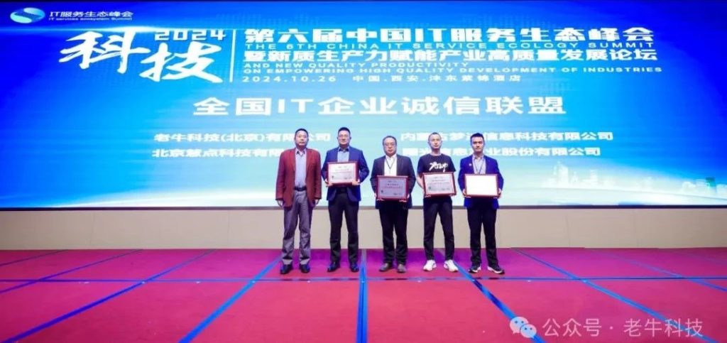 在2024年10月26日于西安举行的高度期待的第六届中国IT服务生态峰会上,我单位荣获了诚信联盟授牌。本次峰会由于其在推动数字经济和探索新质生产力方面的重要作用而受到全国乃至全球范围内的极大关注。在激烈的竞争中,我单位凭借过去一年内在IT服务领域内的杰出表现和创新性成果,从众多参评单位中脱颖而出。本次获奖不仅是对我们团队辛勤工作的肯定,更是对我们研发能力和服务质量的高度认可。